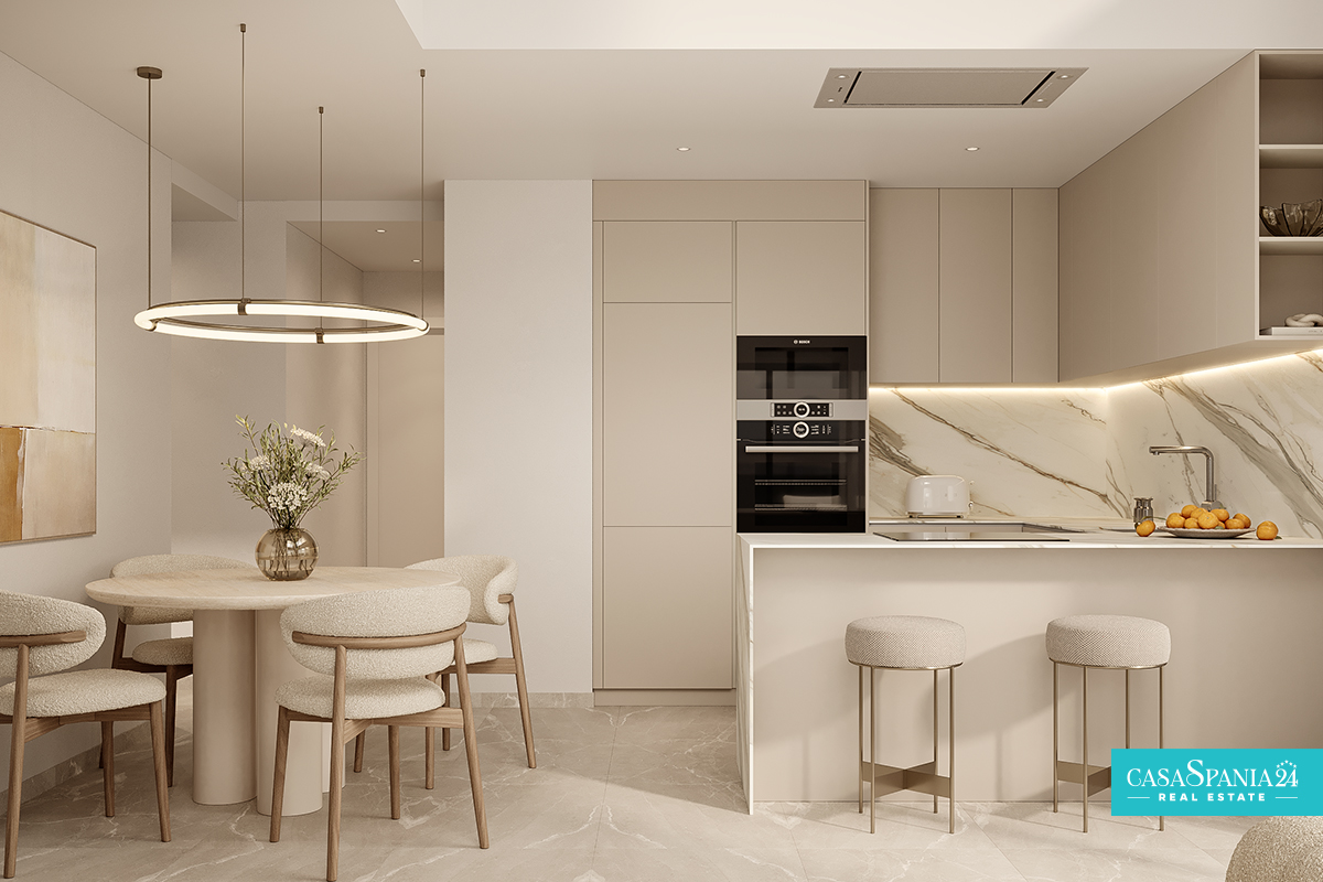 Køkkenet er udstyret med store møbler, både nedhængte og nedhængte. Porcelænsbordplader med naturstenslook. Hvidevarerne inkluderer induktionskogeplade, ovn, emhætte og mikrobølgeovn. En indbygget opvaskemaskine og køleskab er også inkluderet.