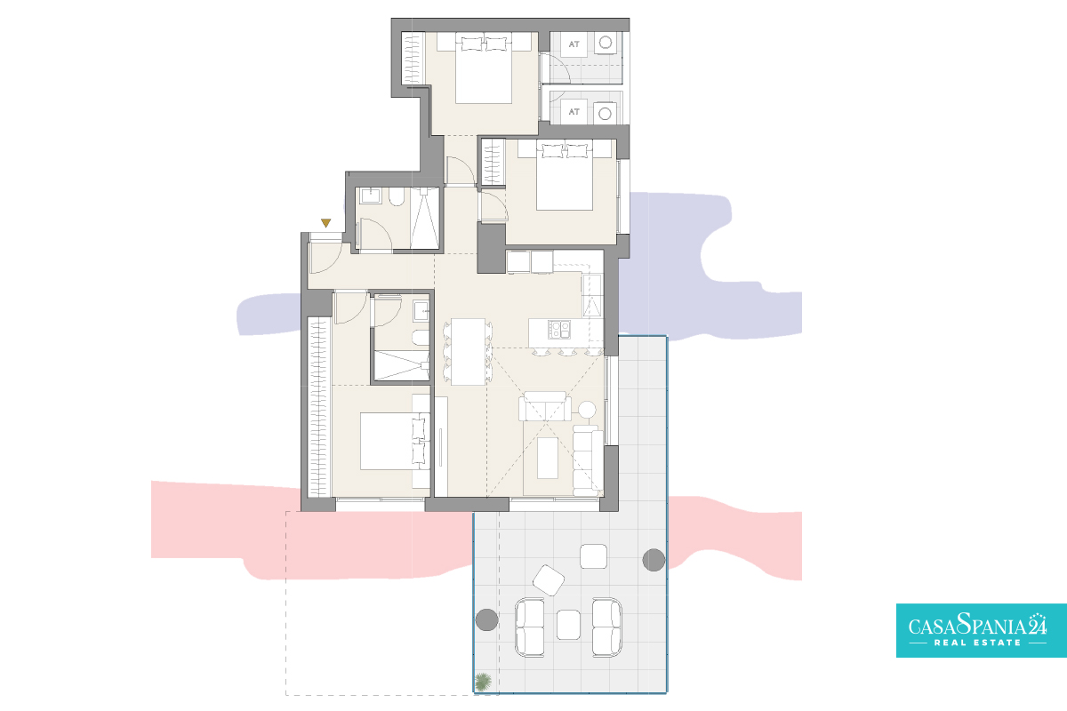 Oplev komforten i en elegant lejlighed med 3 soveværelser, 2 badeværelser, stue med integreret køkken og en spektakulær terrasse på 34 m², ideel til dine afslapningsstunder. Boligen har en parkeringsplads og et opbevaringsrum i kælderen. Garagen vil være forudinstalleret til opladning af elbiler i overensstemmelse med gældende regler. Adgang til komplekset har en automatisk port med fjernbetjening.