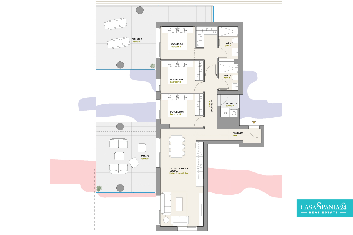 Oplev komforten i en elegant lejlighed med 3 soveværelser, 2 badeværelser, stue med integreret køkken og 2 spektakulære terrasser på 30 m² og 27 m², ideelt til dine afslappende øjeblikke. Boligen har en parkeringsplads og et opbevaringsrum i kælderen. Garagen vil være forudinstalleret til opladning af elbiler i overensstemmelse med gældende regler. Adgang til komplekset har en automatisk port med fjernbetjening.